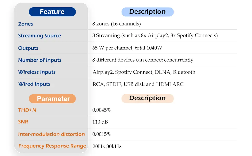 - AmpVortex-16060: This model is perfect for those looking for a robust multi-room audio solution. It supports 8 zones with 16x 65W output, making it ideal for a variety of room sizes. It also supports AirPlay2, Spotify Connect, DLNA, and Bluetooth, ensuring seamless connectivity with all your devices.
