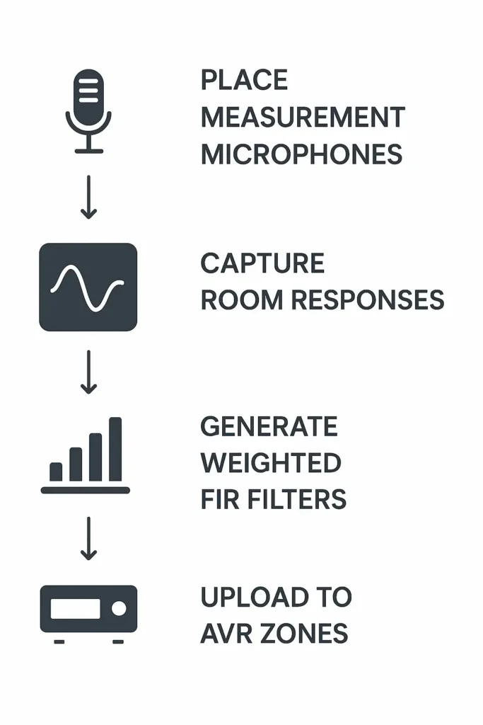 Visual: Microphone icons around listening area, arrows showing signal capture, FIR processing, upload to AVR zones.