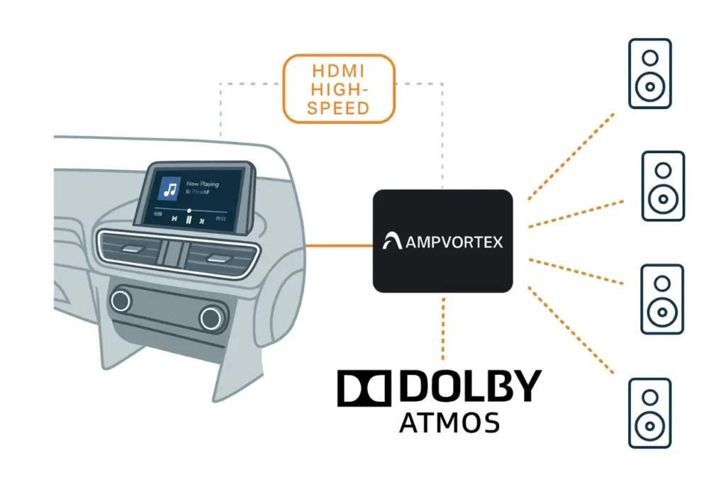 With AmpVortex, in-car music goes beyond traditional stereo, offering a fully immersive Atmos music experience on the road.