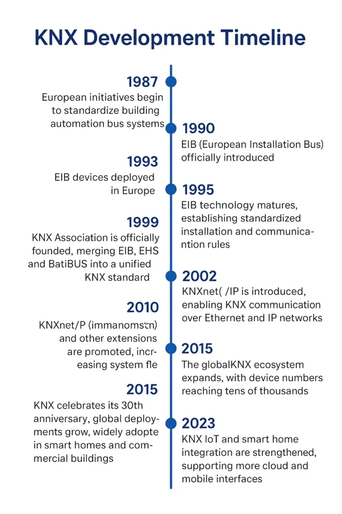 • 2023: KNX IoT and smart home integration are strengthened, supporting more cloud and mobile interfaces.