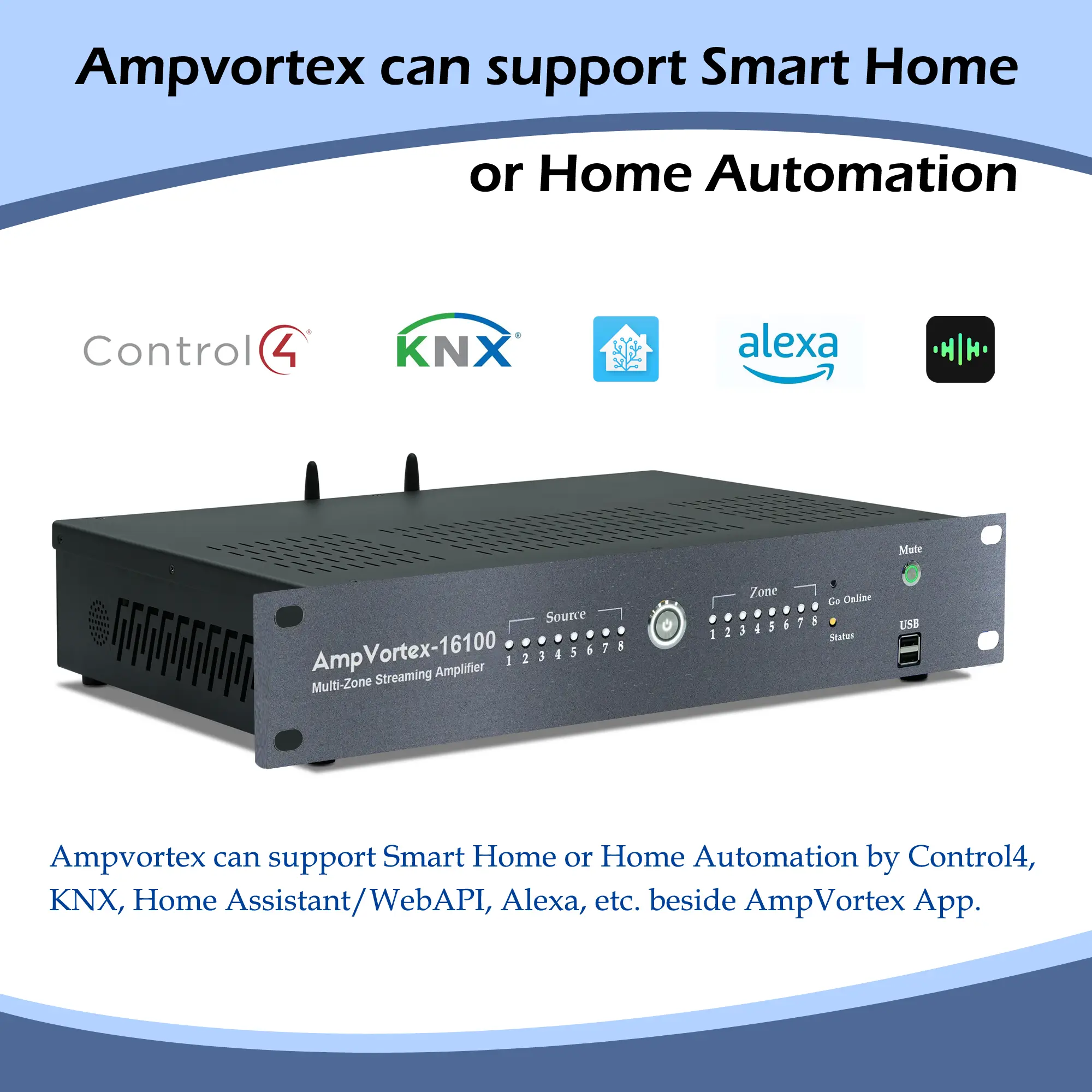 Absolutely. You can integrate it into your smart home in several ways: Mobile App, Web API, KNX, or voice assistants. We provide a Web API that allows you to freely connect and control your AmpVortex-16100 through your Home Assistant system. You can also contact us to obtain free home assistant plugin.