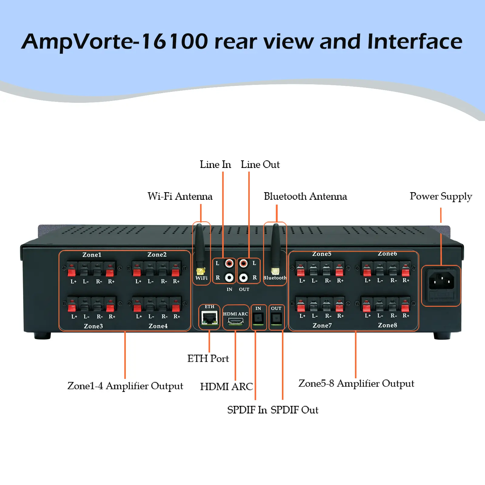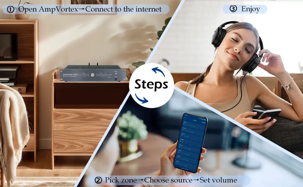 Each AmpVortex-16100 supports up to 8 zones per device. Many competing models only offer 1, 3, or 6 zones, but with AmpVortex, you can easily expand your system. Simply add more units—either the same model or different AmpVortex models—to power 8, 16, 24, 32 zones, or even more for larger installations.
