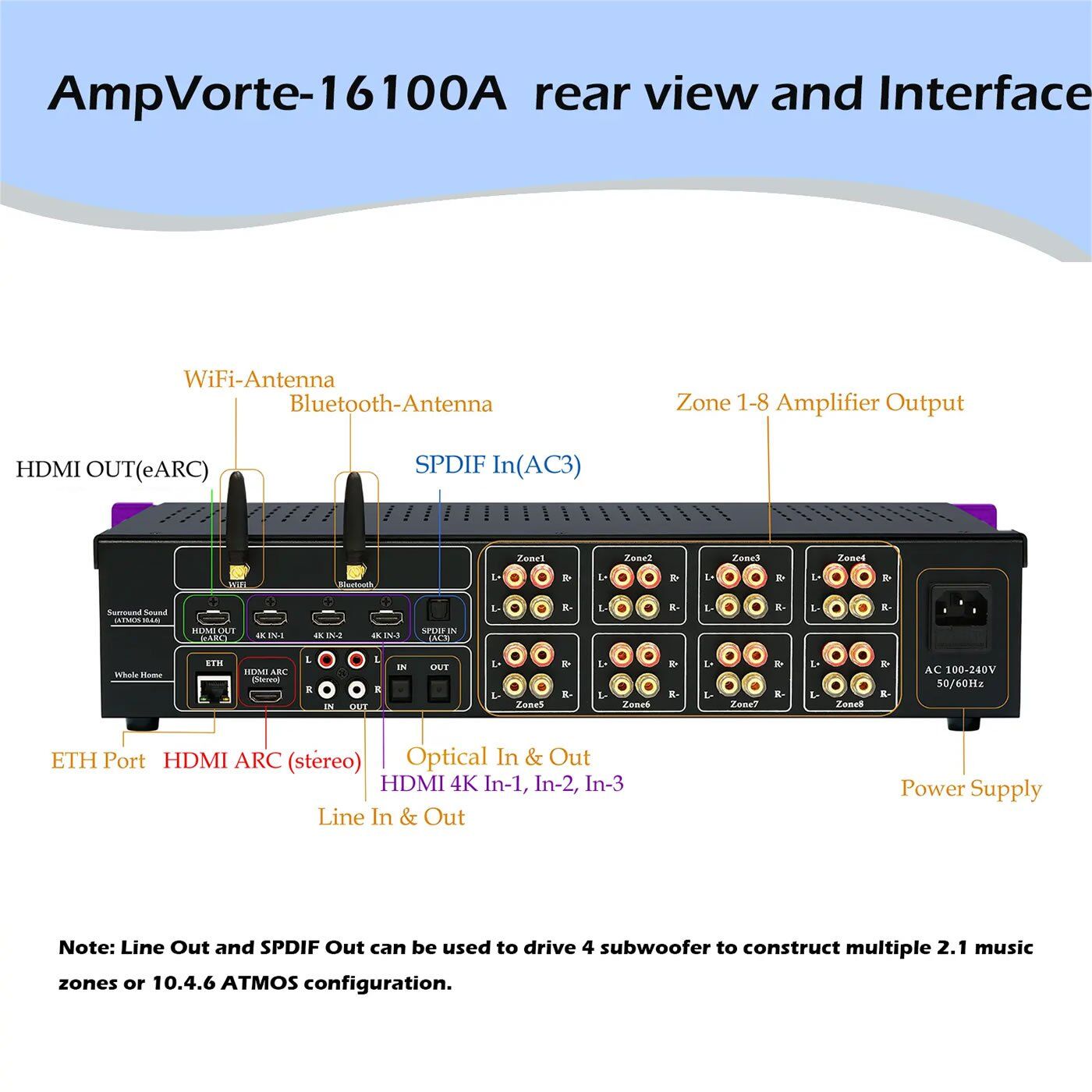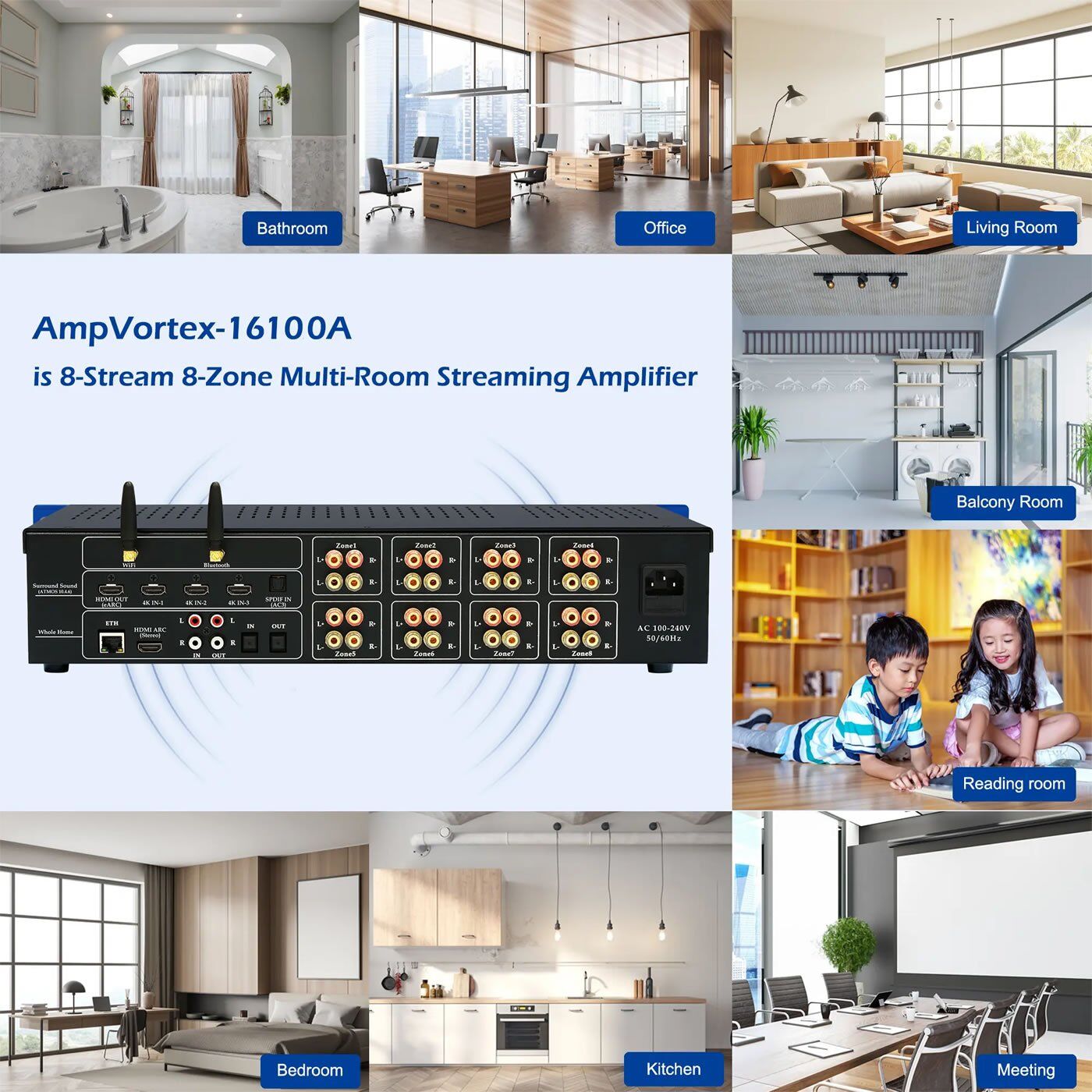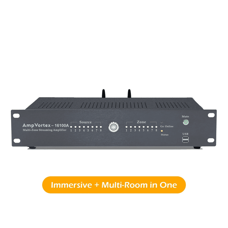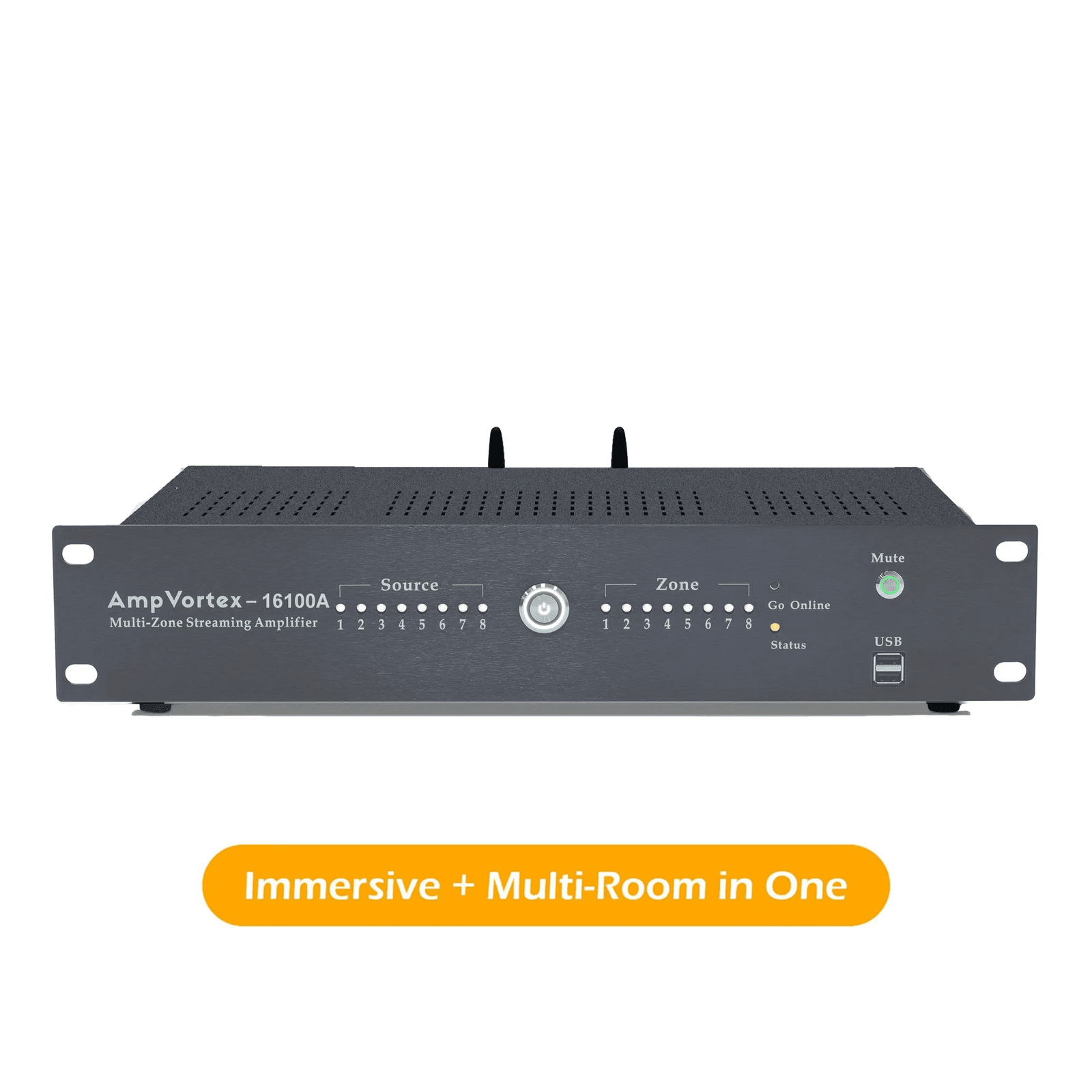 The AmpVortex-16100 and AmpVortex-16100A are both advanced multi-zone streaming amplifiers designed for whole-home audio systems. While they share many features, the primary distinction lies in their support for Dolby Atmos.