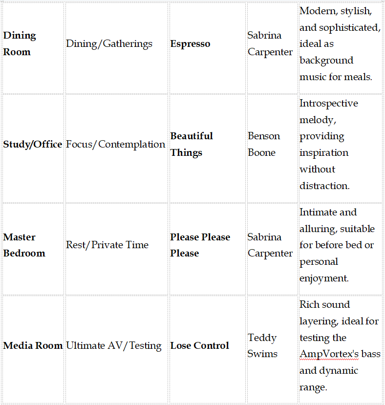 To achieve the perfect home music experience, the key is matching the song’s vibe to the room’s function. Below is an ideal pairing scheme for a typical American home with currently trending songs, all unified and driven by the AmpVortex-16060: