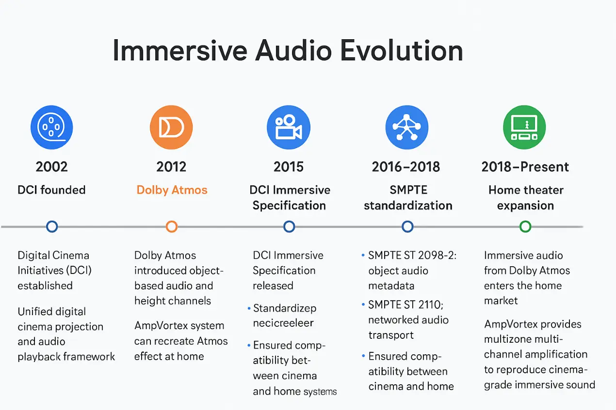 Immersive audio has redefined cinematic experiences in both commercial theaters and high-end home cinemas. The development of the DCI Immersive Specification, its formalization through SMPTE standards, and the rise of object-based audio formats like Dolby Atmos have enabled audiences to experience sound in full three-dimensional space. For home users, AmpVortex multi-channel amplifiers make it possible to reproduce cinema-level immersive audio in dedicated theaters or multi-room setups.